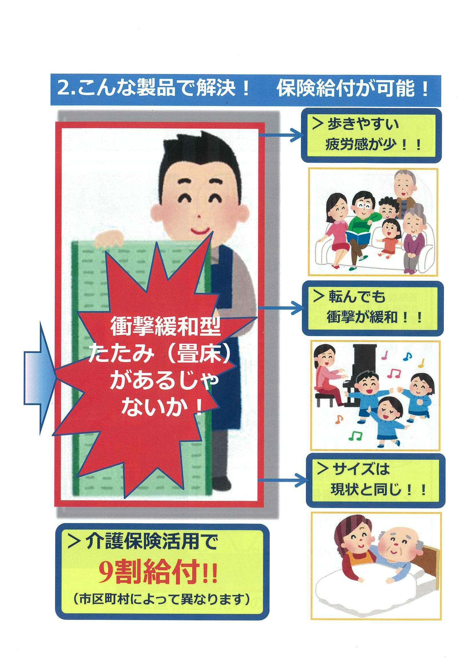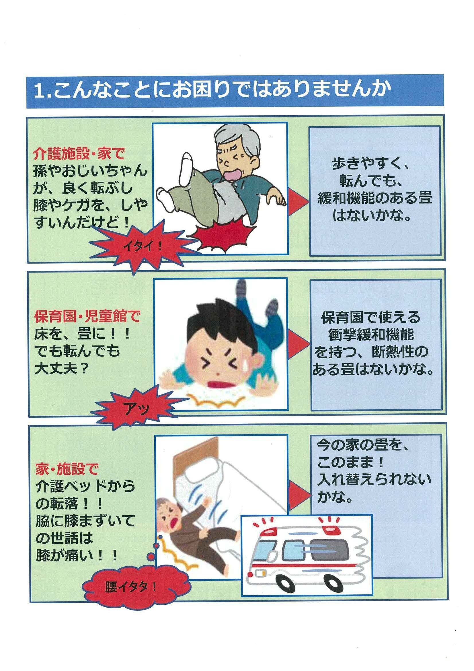 この衝撃緩和型畳床を畳に使用する事により、高齢者、歩行困難者、子ども又は介護者が、快適な生活を送ることが目的です。 |